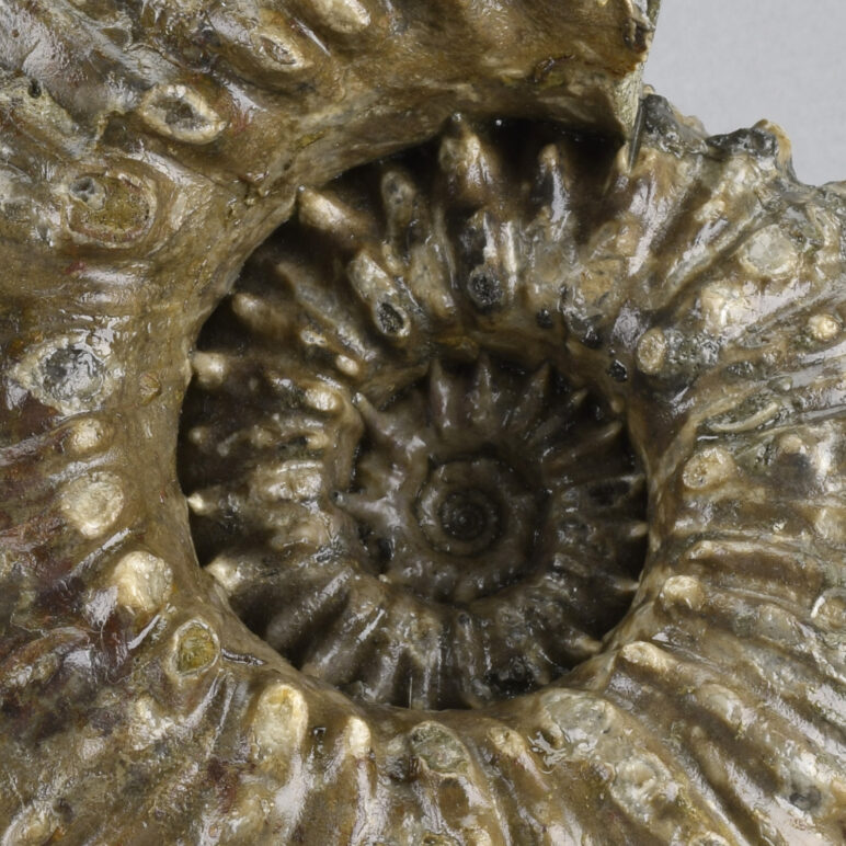 A beautiful ammonite Douvilleiceras mammillatum in gorgeous brown calcitic shell. The inner whorls are superbly preserved.
