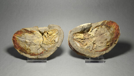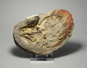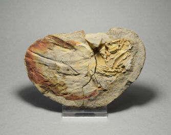 A nice, incomplete coelacanth fish with fine preservation of fins and scales. As usual with fossils from the lower Triassic of northern Madagascar, the specimen consists of the external moulds of the left and right flanks of the fish, preserved in a calcareous concretion.