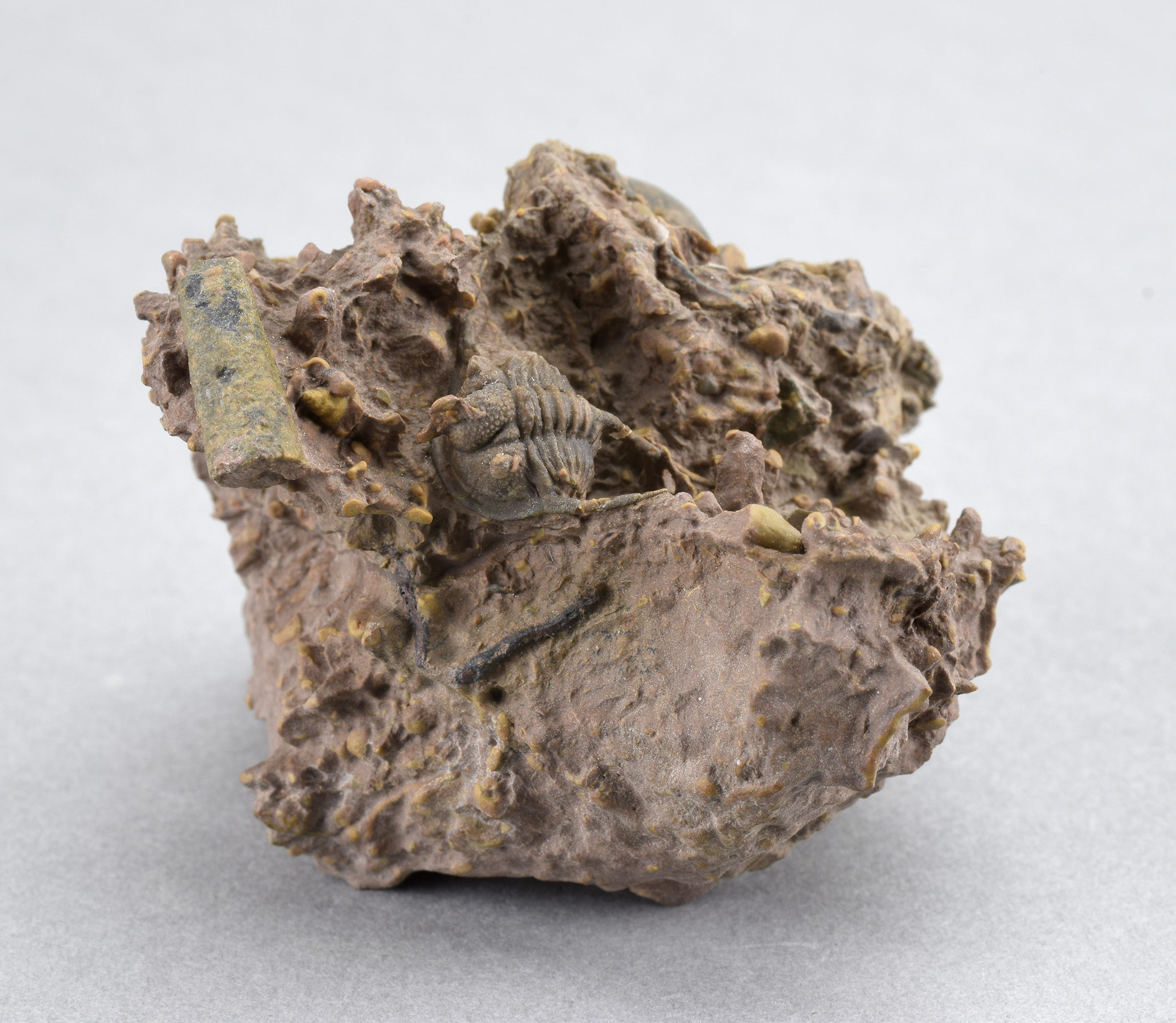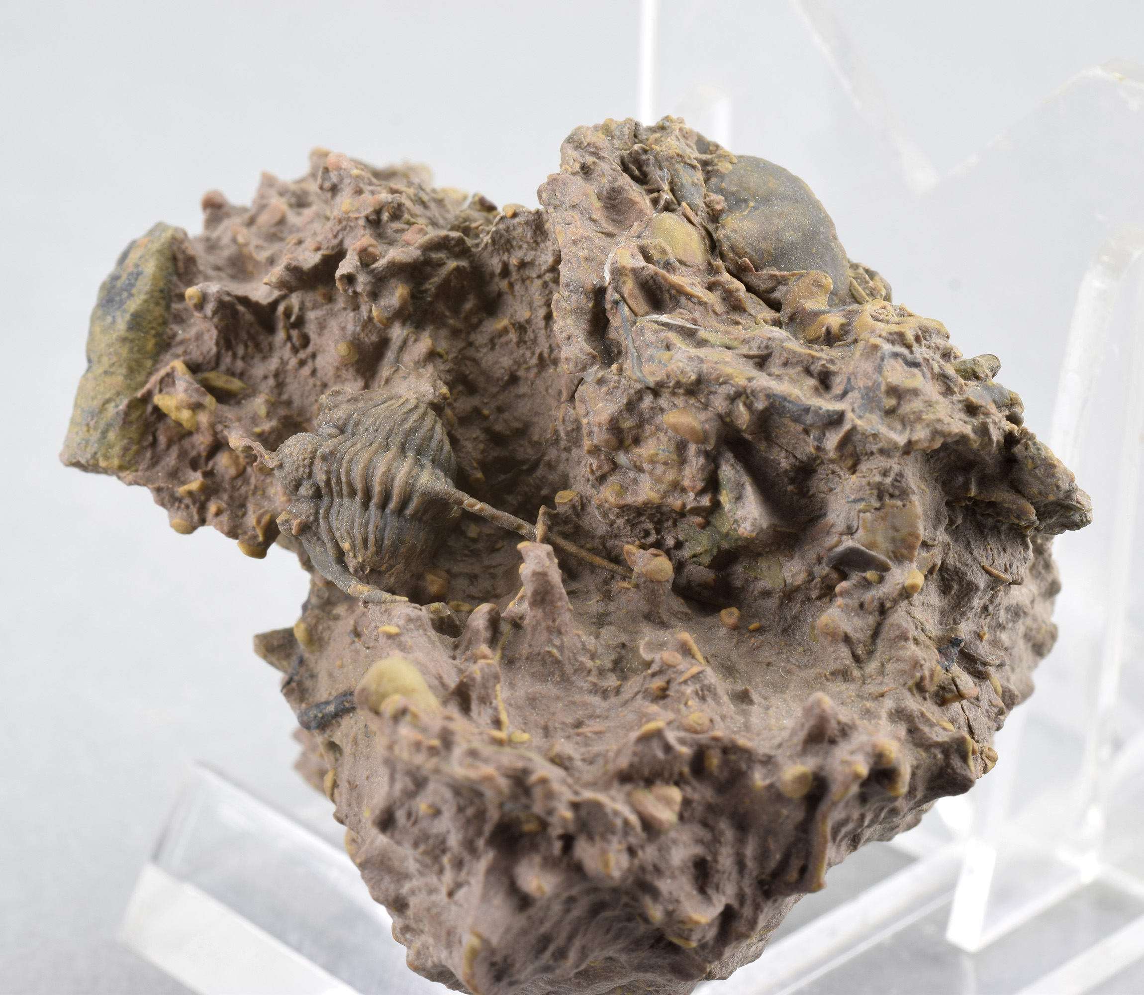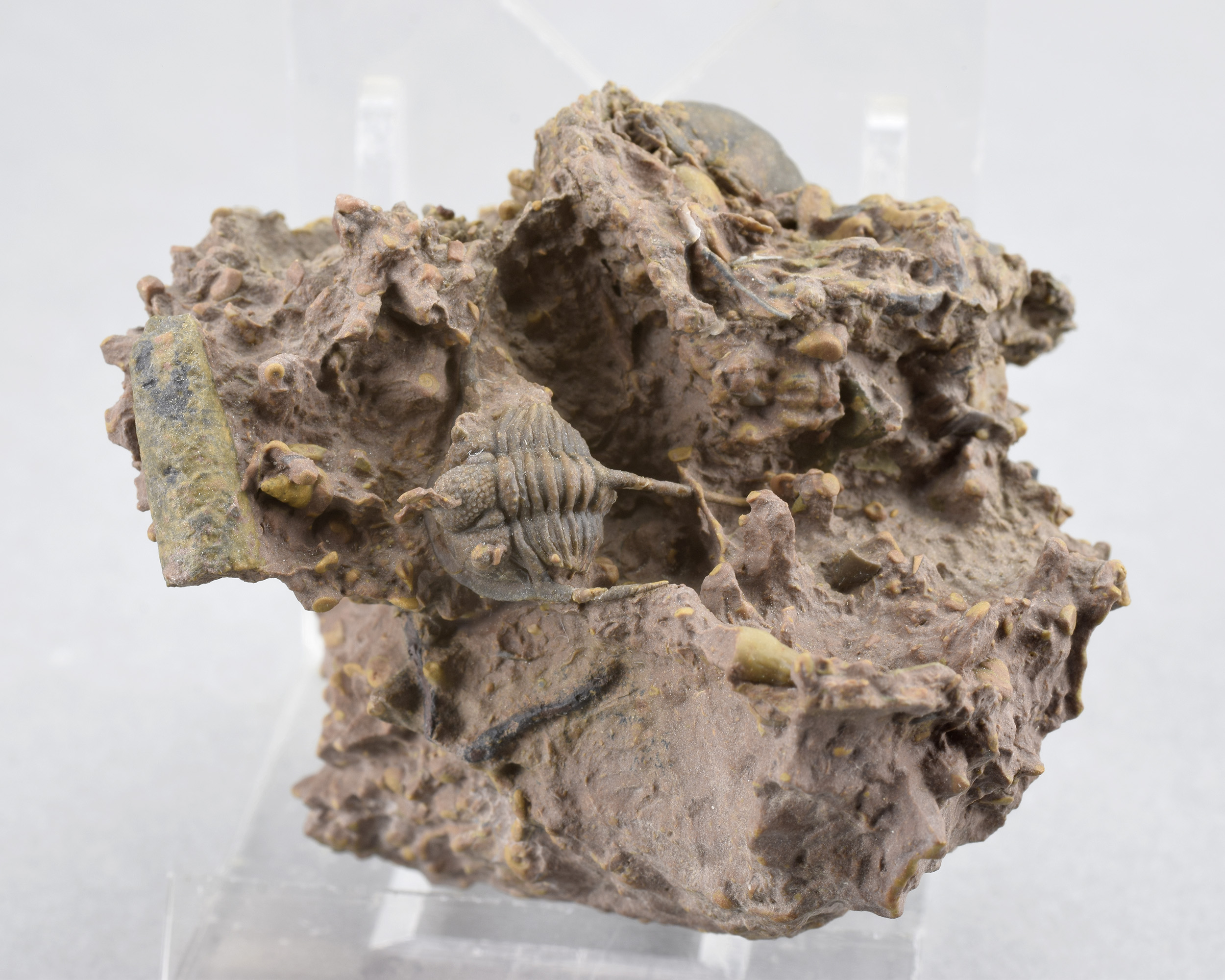 A fine Cyphaspis trilobite in matrix with prepared “microfossils”.