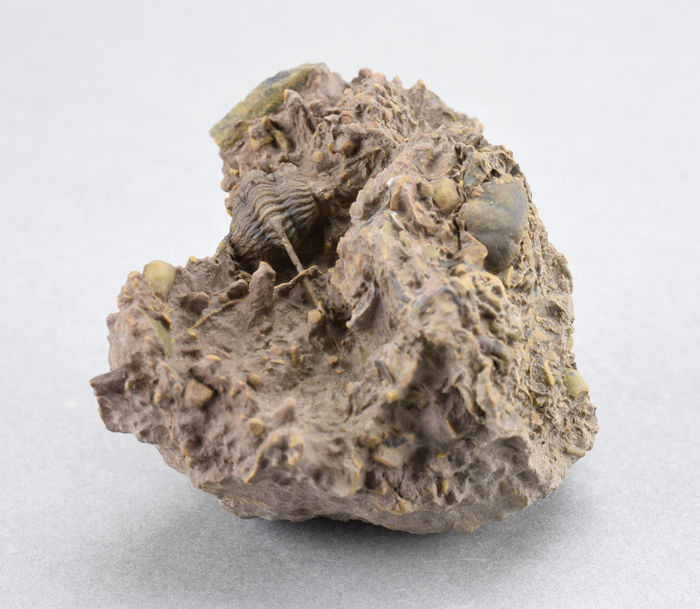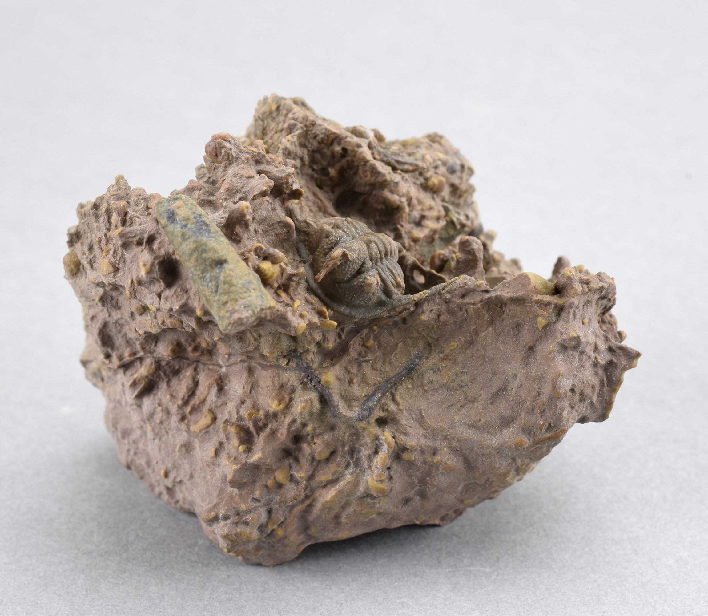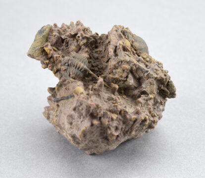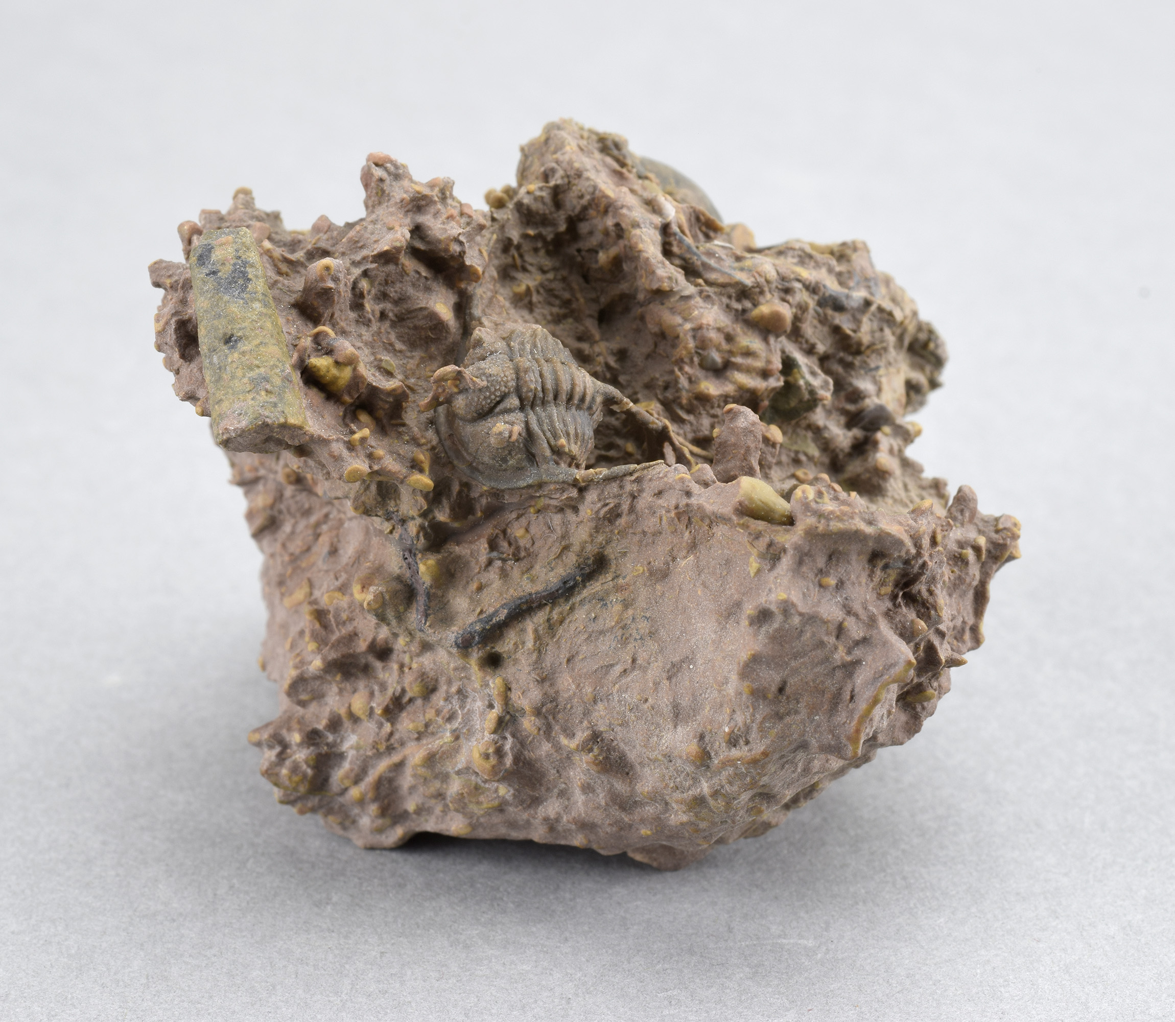 A fine Cyphaspis trilobite in matrix with prepared “microfossils”.