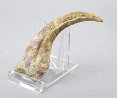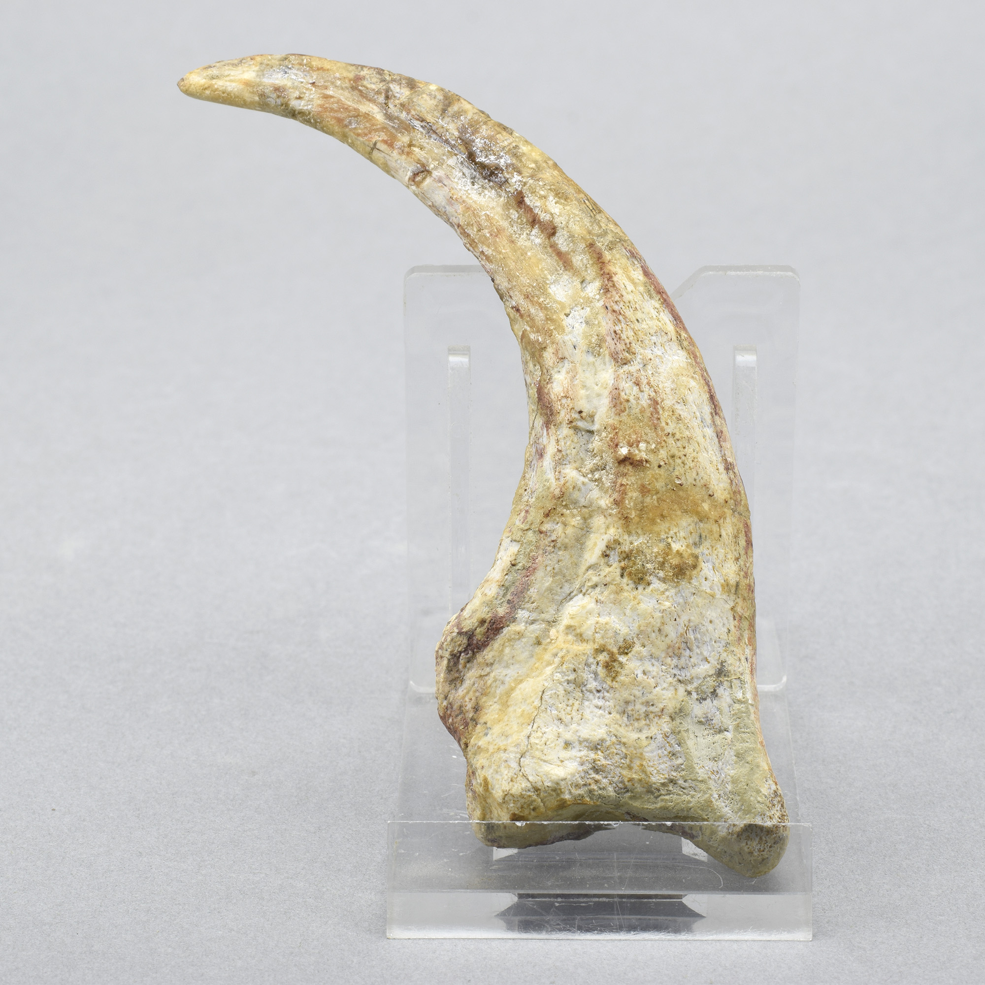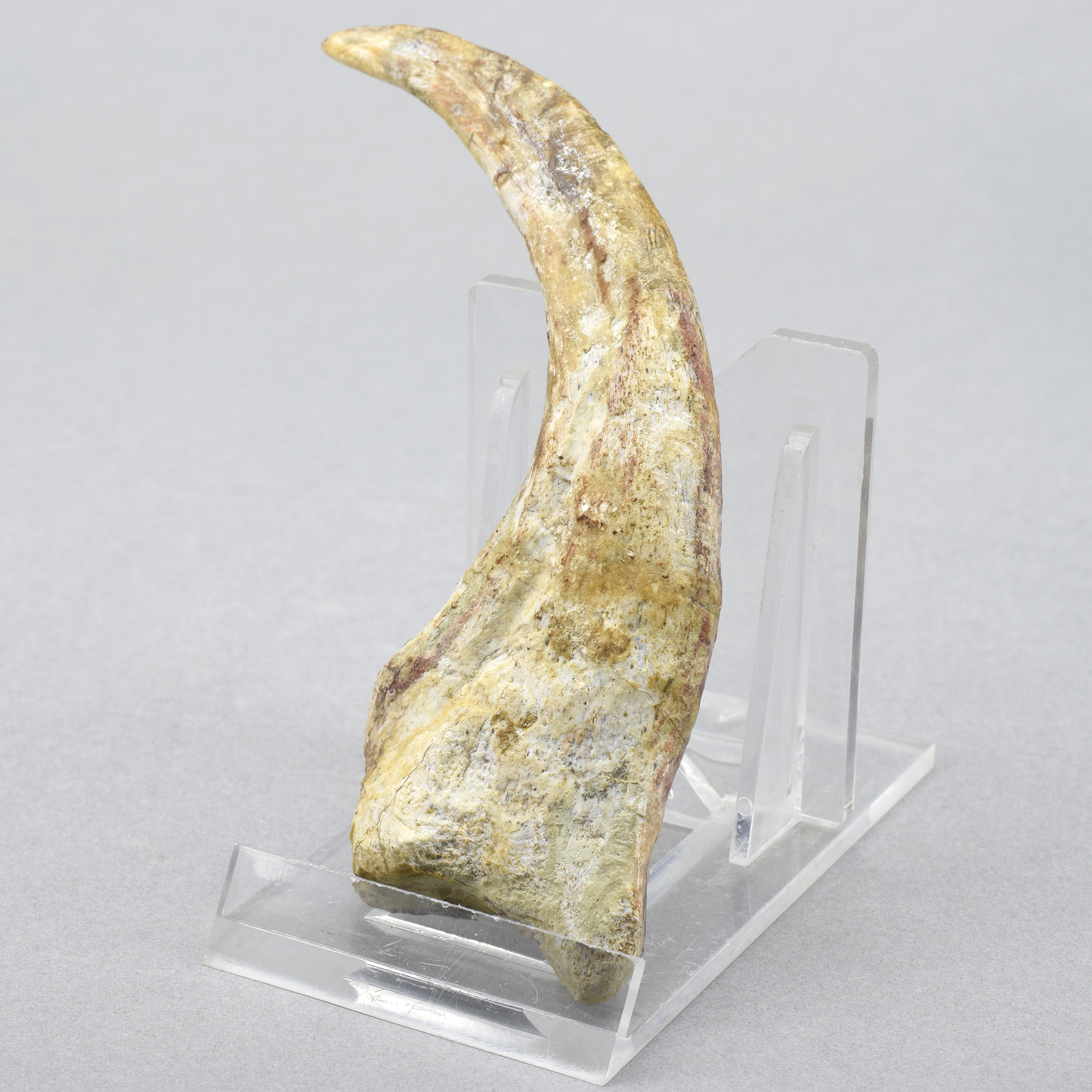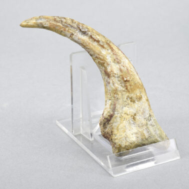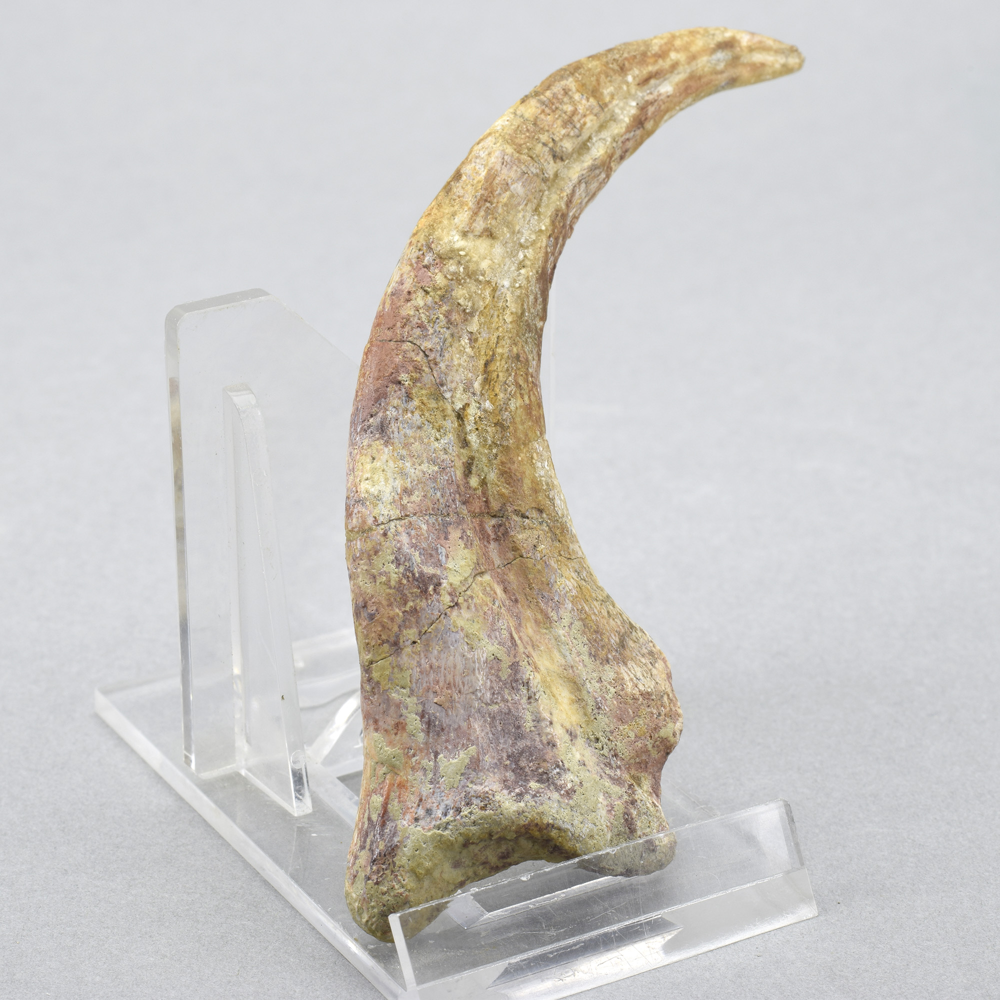 A fine theropod dinosaur claw, tentatively attributed to the genus Spinosaurus. While the tip is restored, the remainder of the specimen is natural and well-preserved.