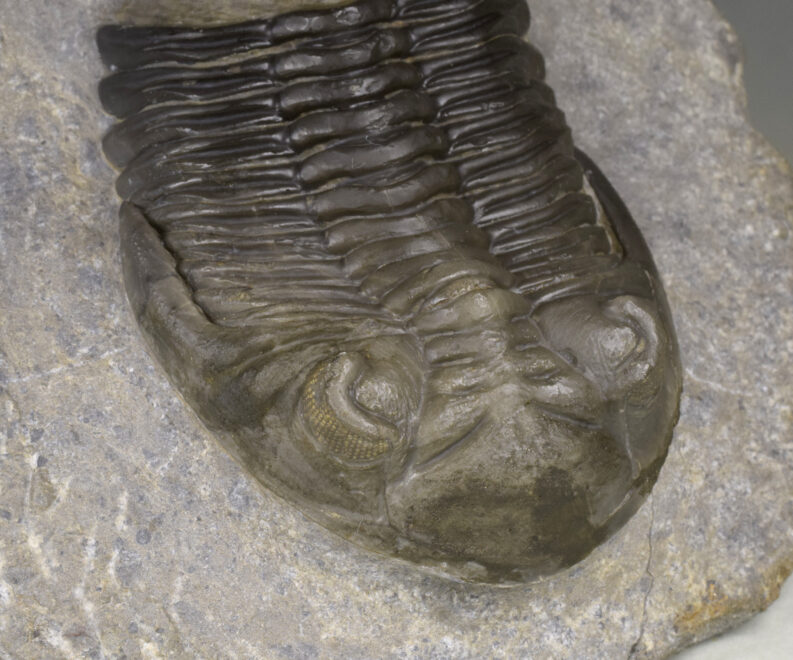 A fine, flying-prepared Cyphaspis, naturally associated with specimens of Hollardops and Phacops.