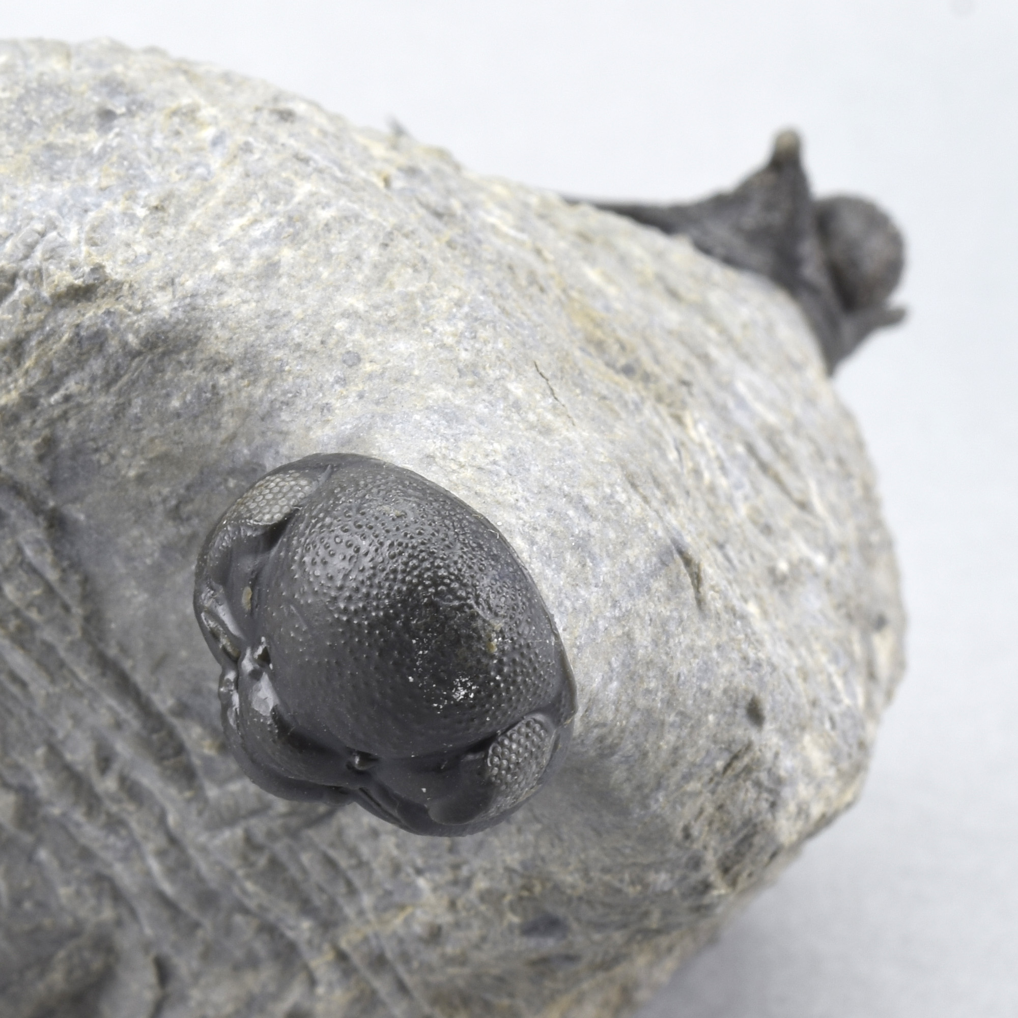 A fine, flying-prepared Cyphaspis, naturally associated with specimens of Hollardops and Phacops.