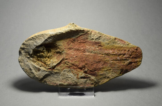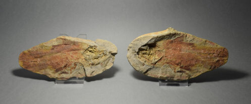 A nice, indeterminate coelacanth fish. As usual with fossils from the lower Triassic of northern Madagascar, the specimen consists of the external moulds of the left and right flanks of the fish, preserved in a calcareous concretion.