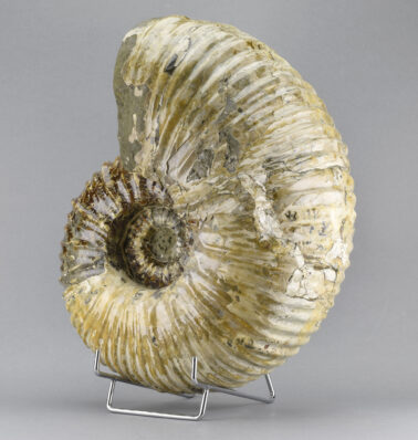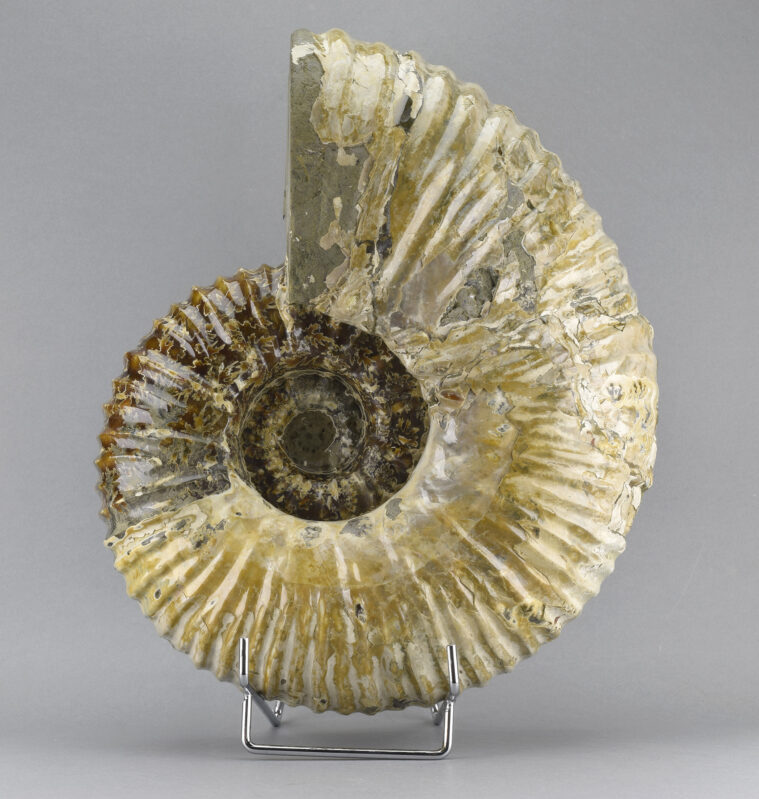 A large polished ammonite Douvilleiceras with beautiful nacreous shell. Both sides of the ammonite are prepared. Very decorative specimen with calcite inner whorls. The stand is not included.