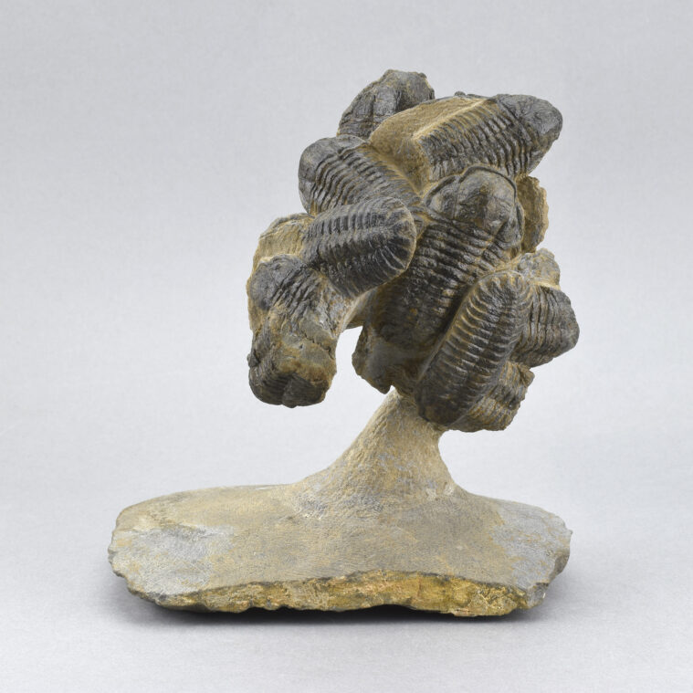 Eccoptochile is a trilobite genus that occurs occasionally in the Ordovician of Morocco, most often represented by imperfectly preserved specimens. While this specimen is no exception, it is particular in that it consists of a mass-occurrence of 9 complete and 6 partial specimens, all unrestored.