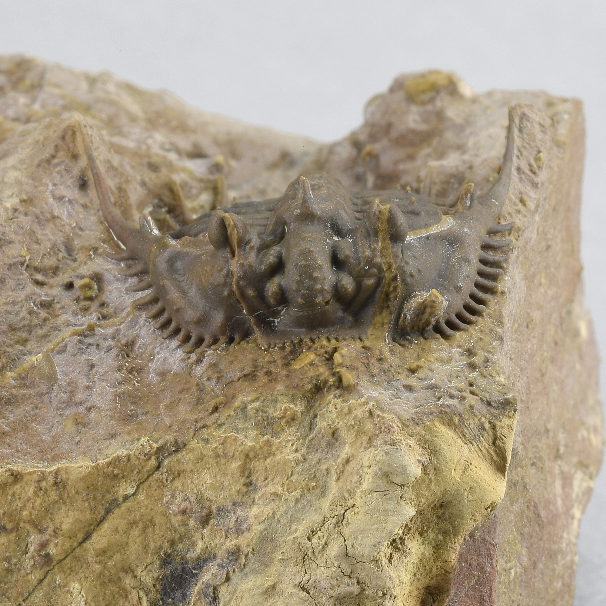 The arrangement of pygidial spines of this exquisite Kettneraspis is very close to that of the recently described Kettneraspis dickinsoni van Viersen et al. 2025. This rare trilobite is exquisite, shows beautiful caramel colour, stunning and well-preserved occipital horn, marginal cephalic spines and secondary spines on the genal spines.