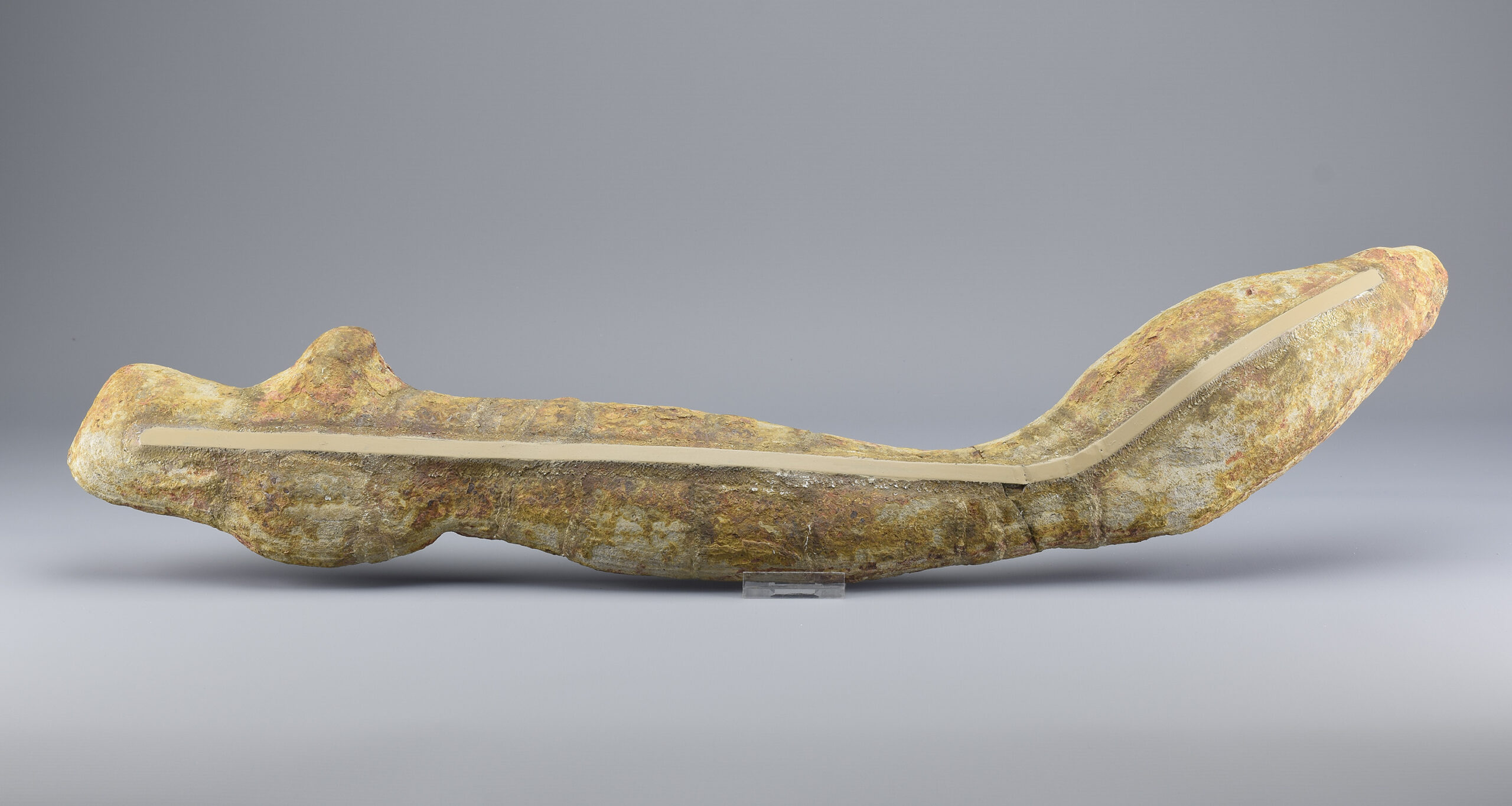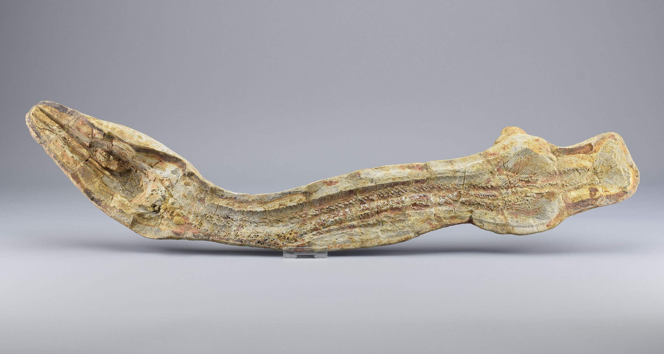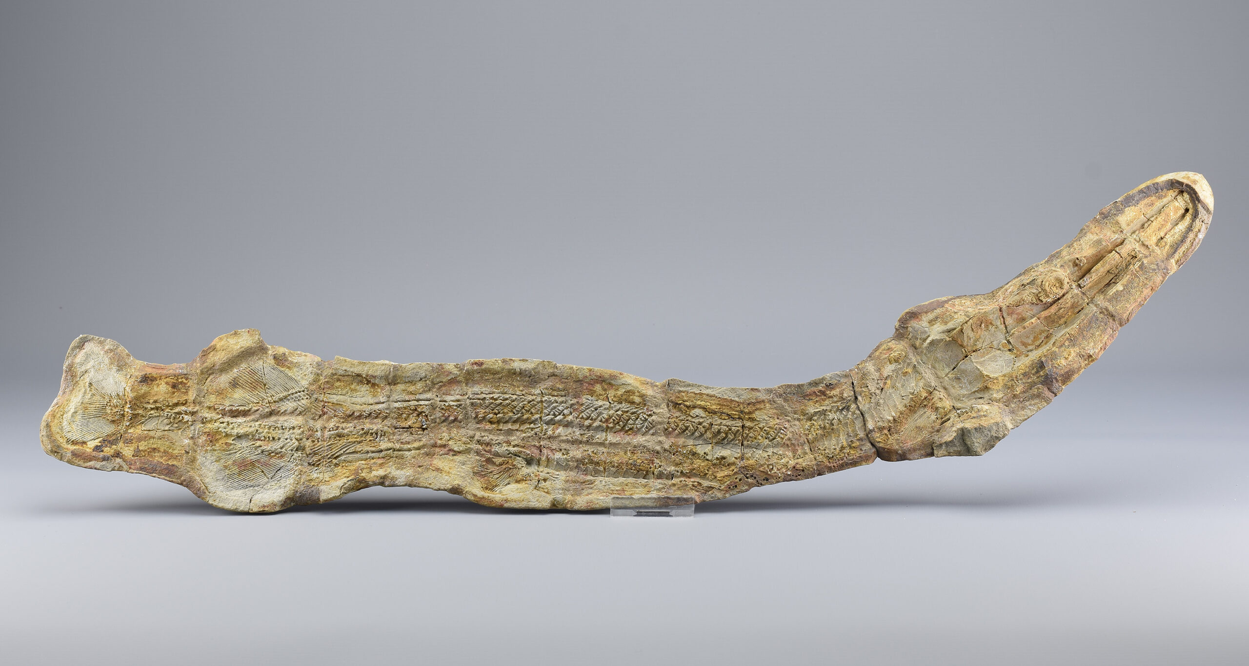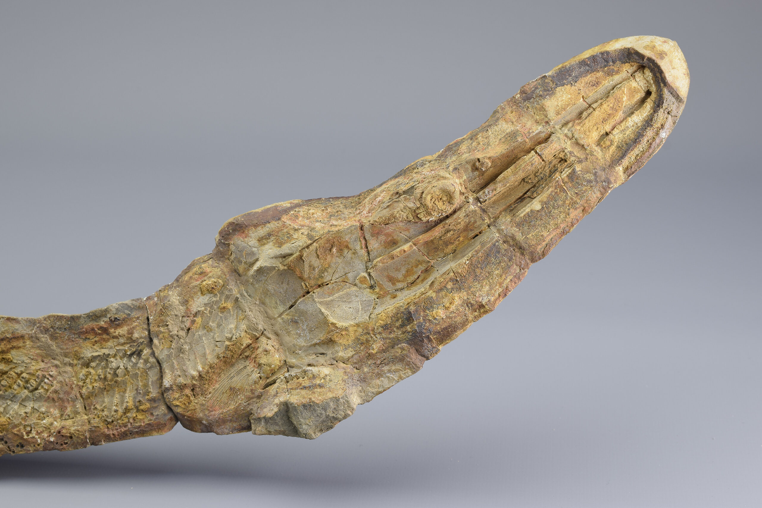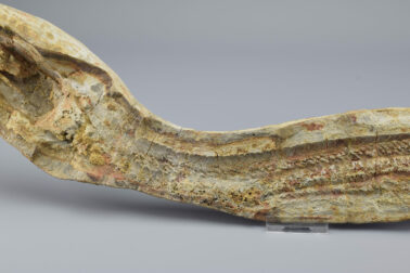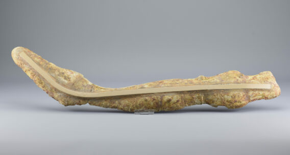 A superb ray-finned fish of the Saurichthyidae family. This exceptional specimen is complete and consists of two parts preserved in a calcareous concretion as internal and external moulds. It shows remarkable detail in the skull, fins and scales, making it a striking and scientifically valuable piece. The concretion was stabilized and reinforced with flat metal supports. Natural cracks have been filled with resin to ensure long-term integrity. There is otherwise no reconstruction of the specimen. It remains completely natural.