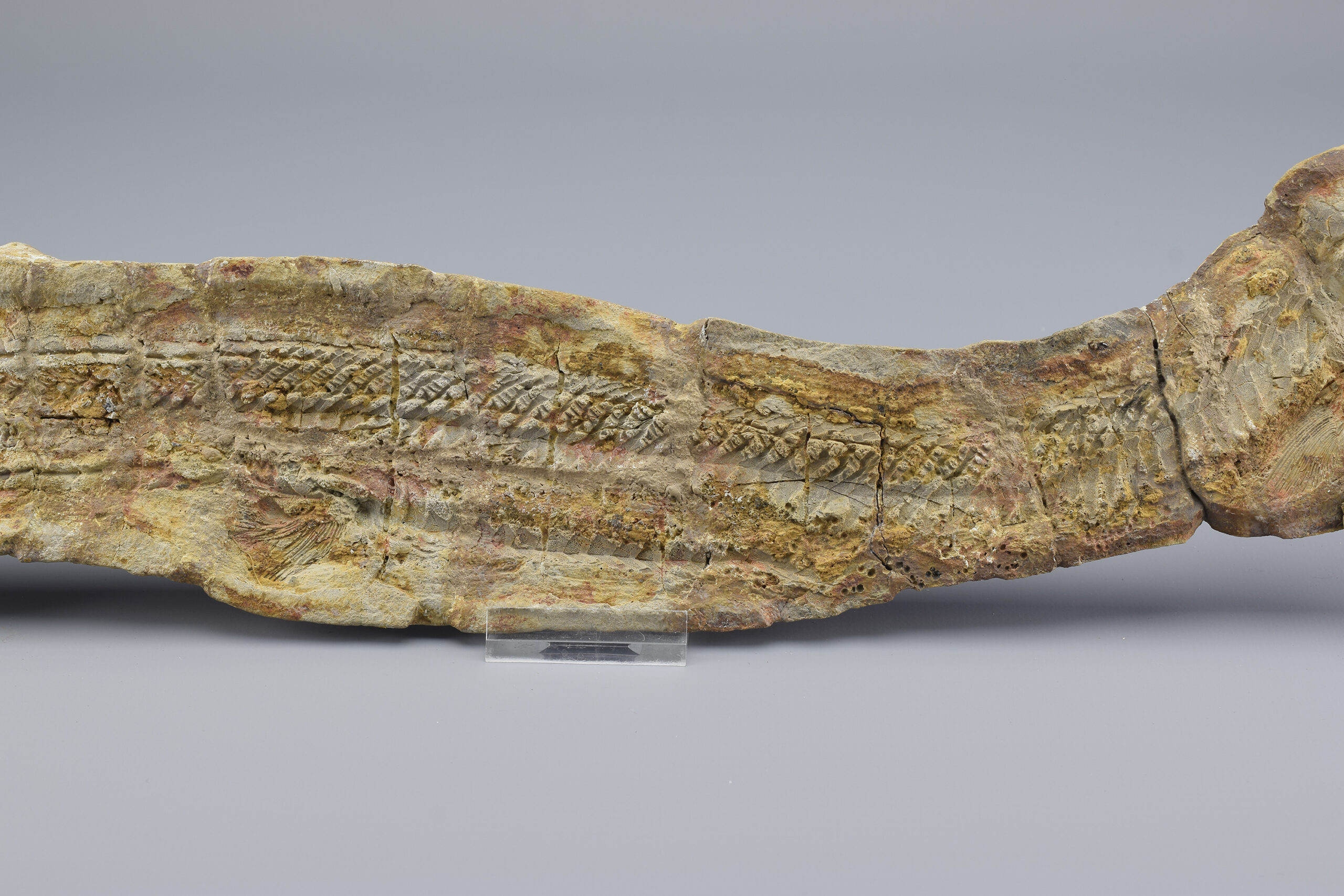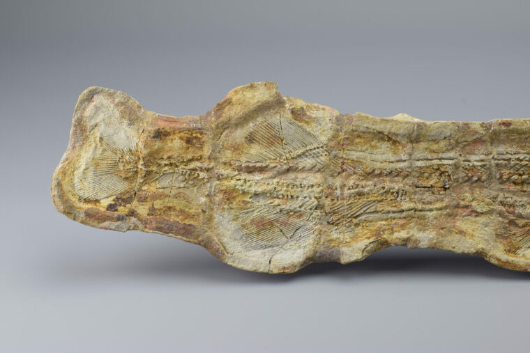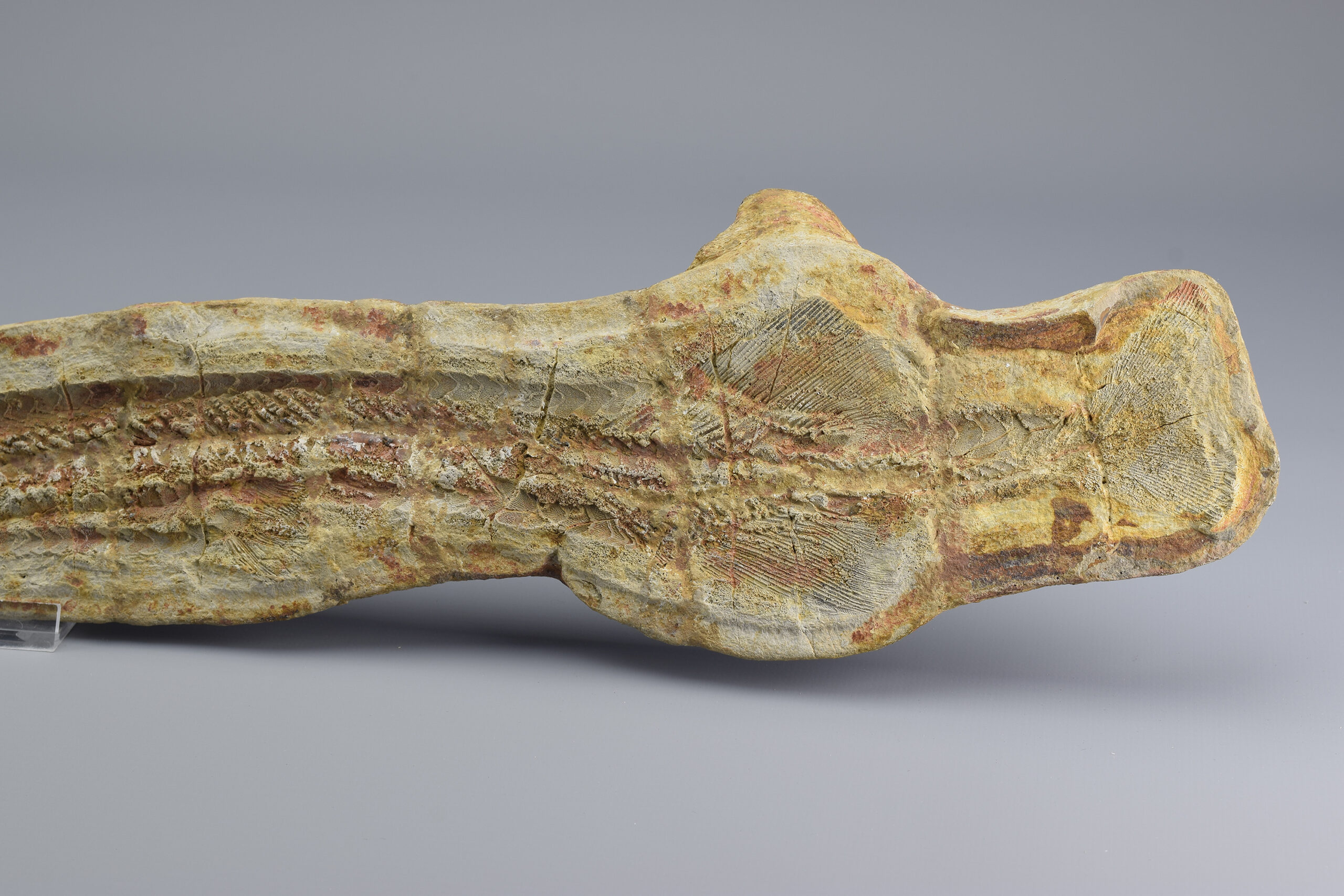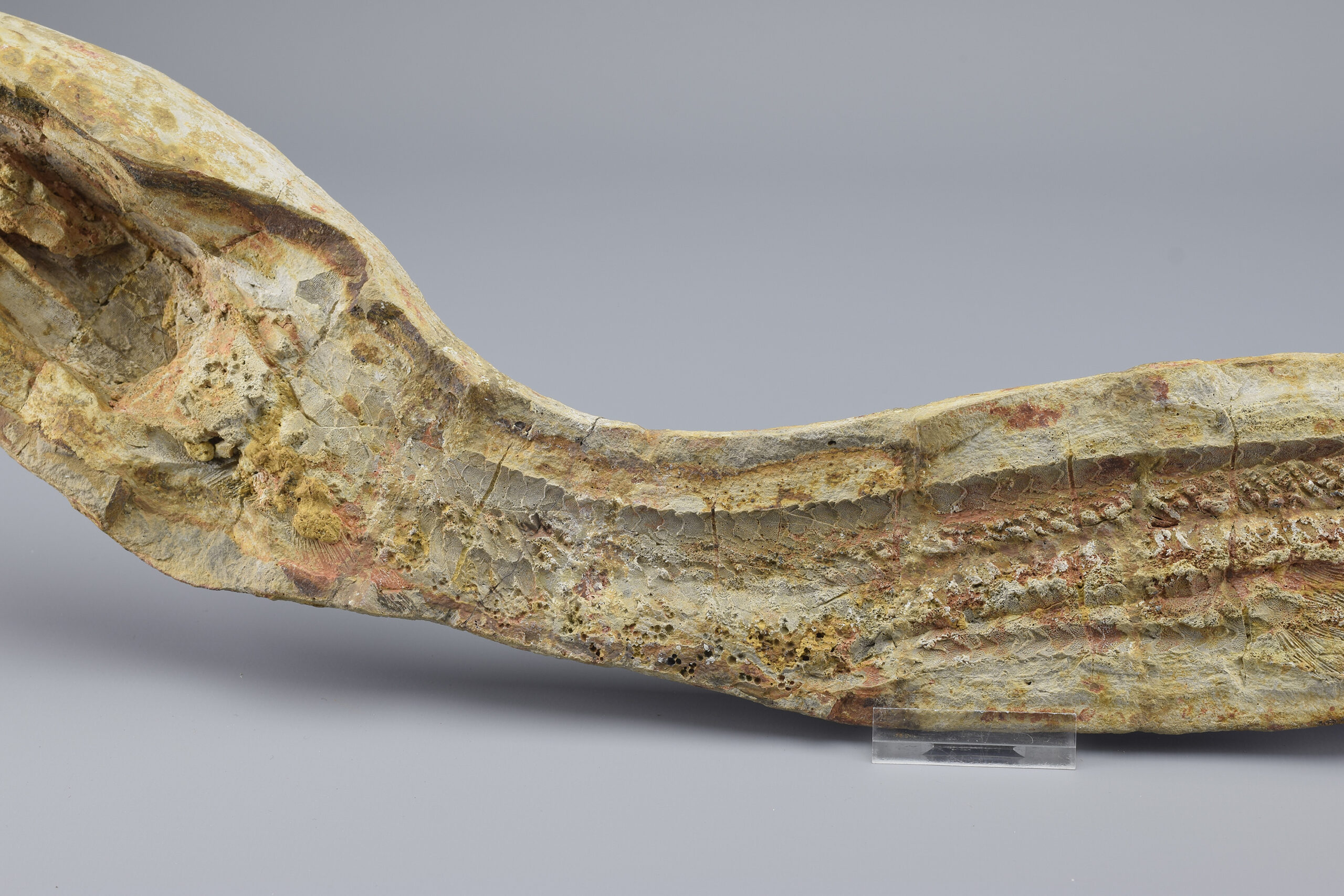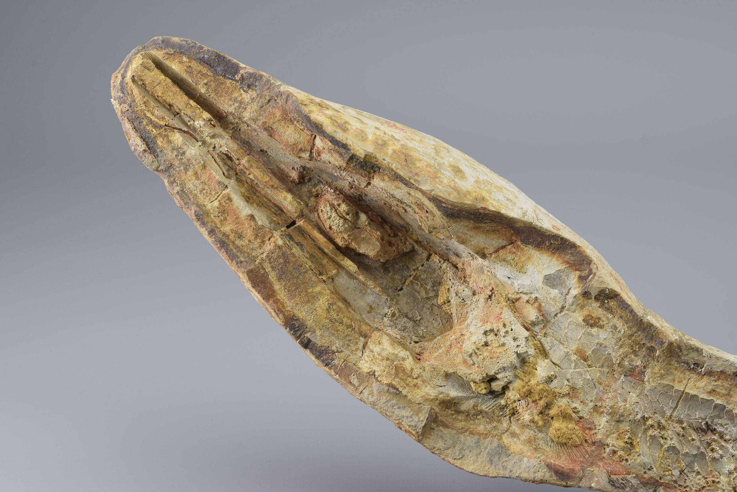 A superb ray-finned fish of the Saurichthyidae family. This exceptional specimen is complete and consists of two parts preserved in a calcareous concretion as internal and external moulds. It shows remarkable detail in the skull, fins and scales, making it a striking and scientifically valuable piece. The concretion was stabilized and reinforced with flat metal supports. Natural cracks have been filled with resin to ensure long-term integrity. There is otherwise no reconstruction of the specimen. It remains completely natural.