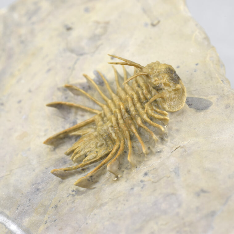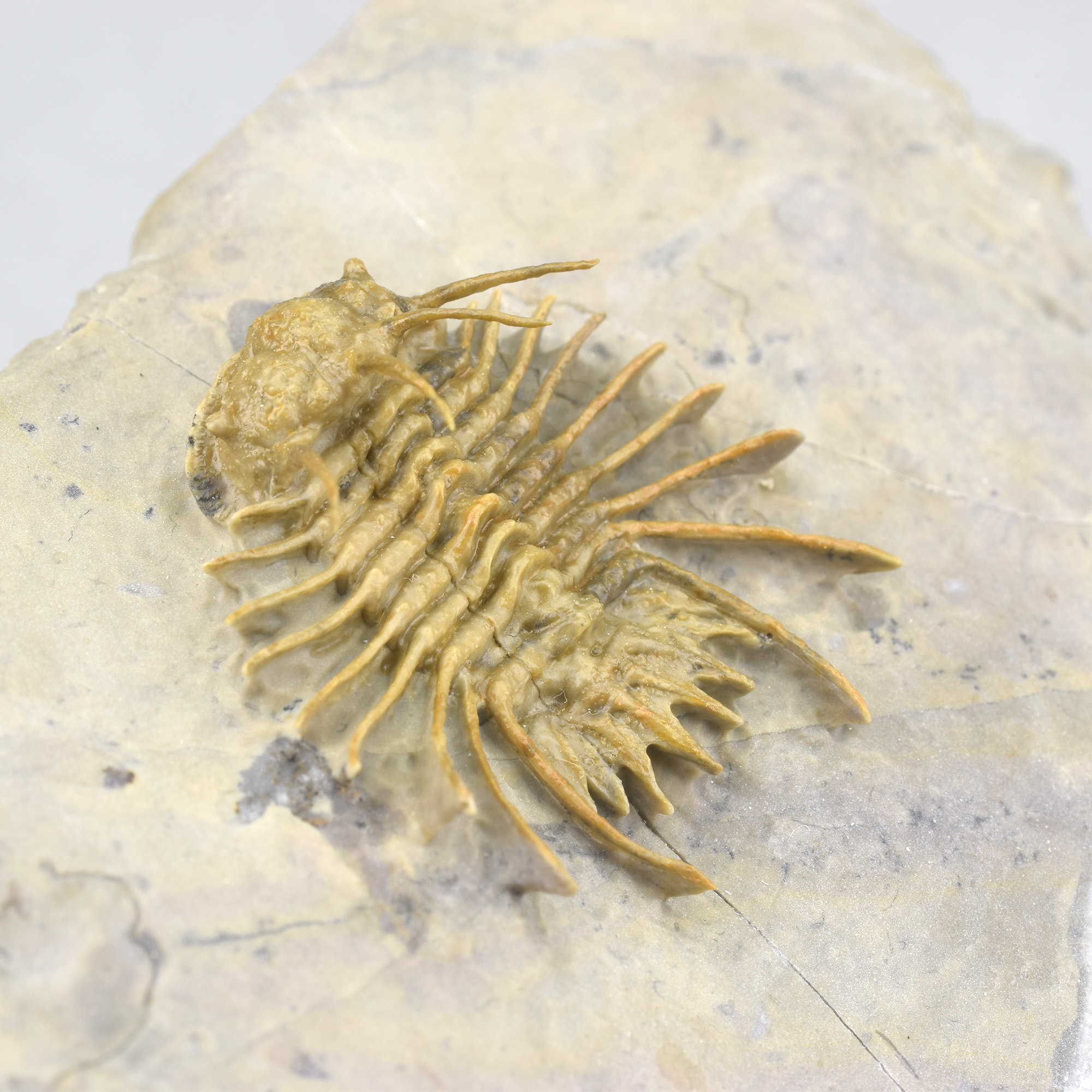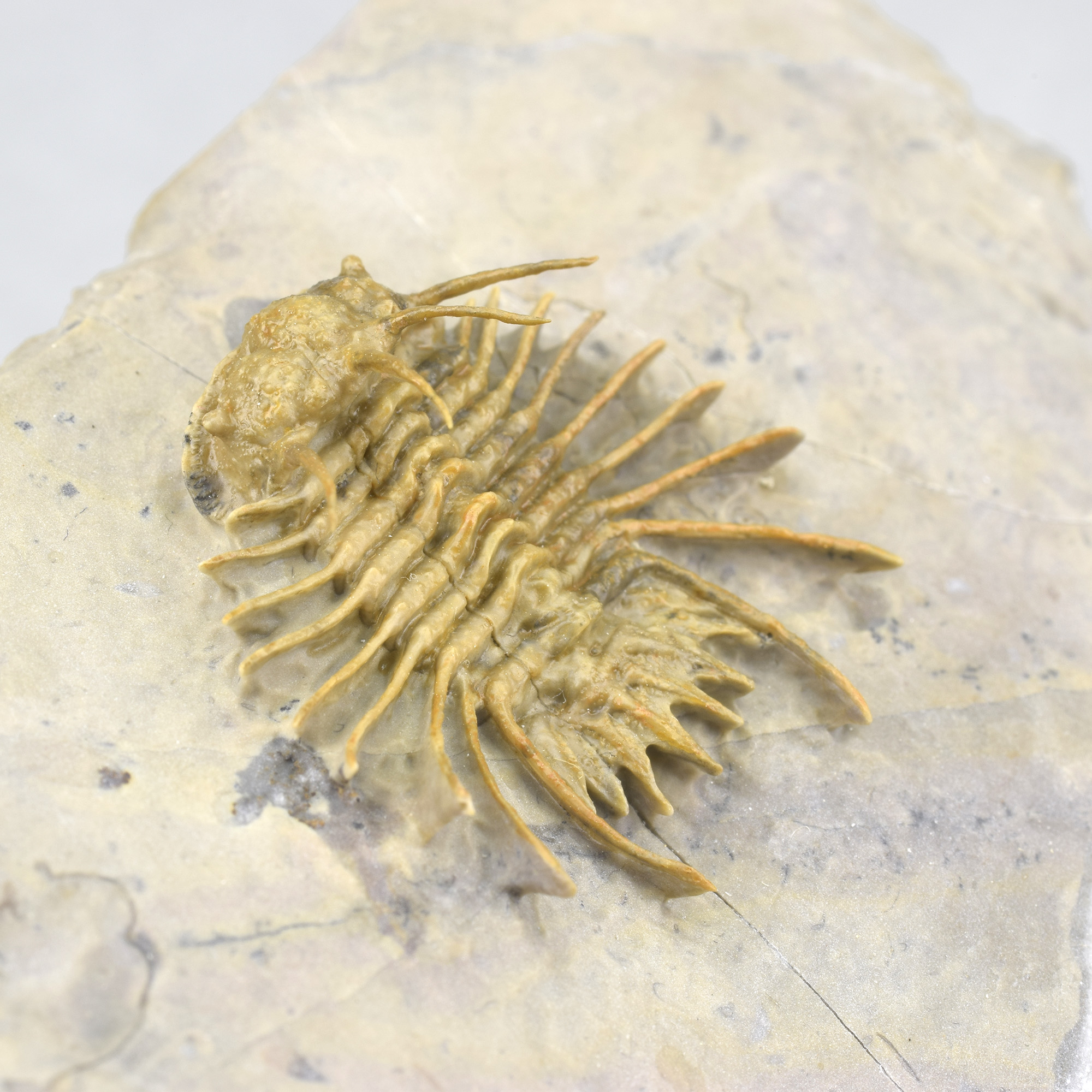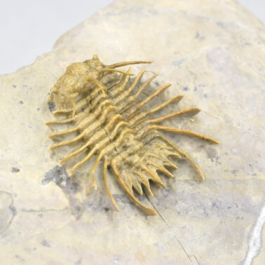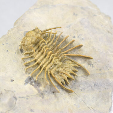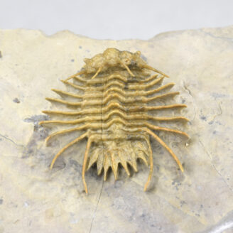 This is a very rare trilobite from Hmar Laghdad, a locality that became famous for its red Devonian trilobites and red trilobites with green eyes. The specimen is an undescribed Odontopleuridae close to the genus Ceratocephala, showing minute ornamentation on pygidial spines. The few specimens known from Hmar Laghdad are brown or yellowish. This bright golden specimen is very beautiful under appropriate lighting and is unrestored.