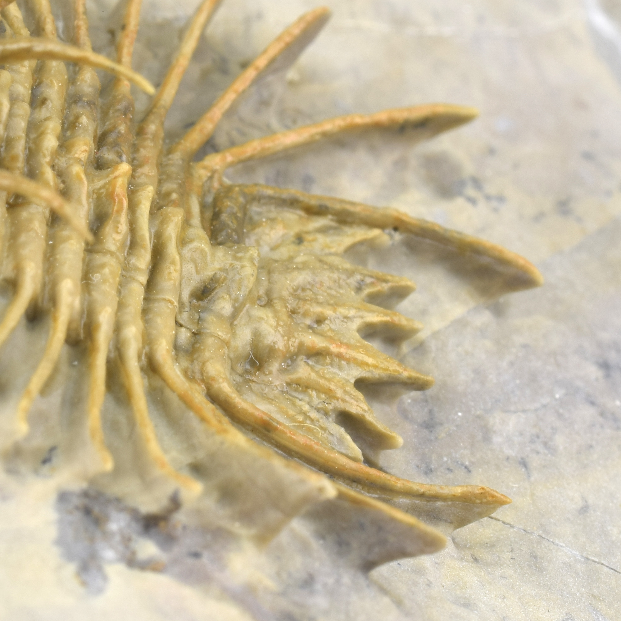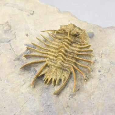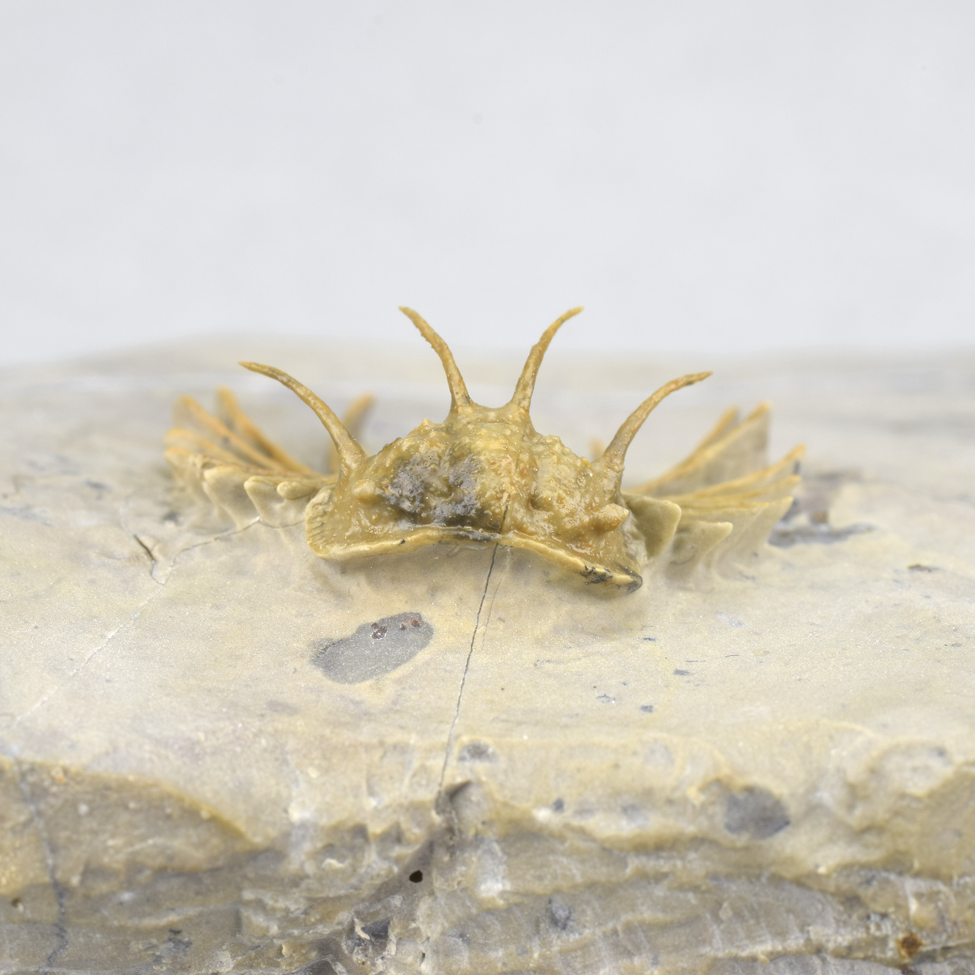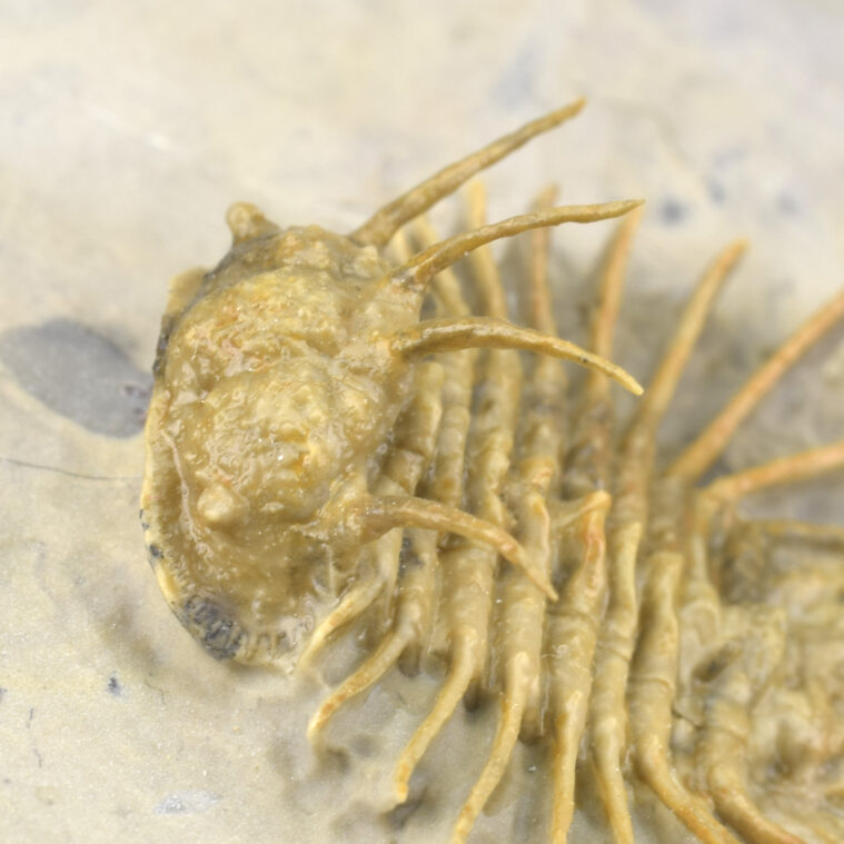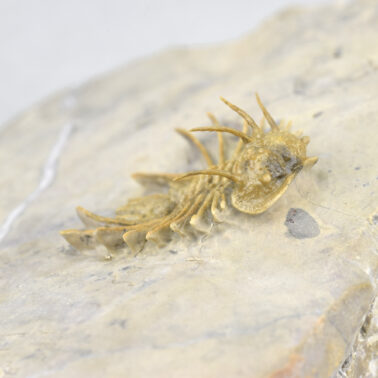 This is a very rare trilobite from Hmar Laghdad, a locality that became famous for its red Devonian trilobites and red trilobites with green eyes. The specimen is an undescribed Odontopleuridae close to the genus Ceratocephala, showing minute ornamentation on pygidial spines. The few specimens known from Hmar Laghdad are brown or yellowish. This bright golden specimen is very beautiful under appropriate lighting and is unrestored.