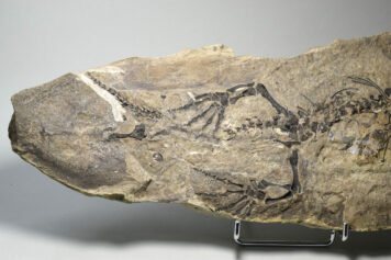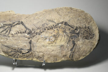 Madagascar is famous for its large reptiles of the genus Claudiosaurus. Most of these are however restored. We present a wonderful Barasaurus besairiei, a somewhat smaller species that is rarely found complete. The specimen is natural, mostly complete, quite large for the species, shows superb preservation, great anatomical detail with the bones still in connection and outstanding phalanxes. Specimens with the head preserved are rare. This one is very attractive with the head, teeth, tail, two complete legs and two partial ones, and gastroliths preserved. A partial horsetail is also preserved.